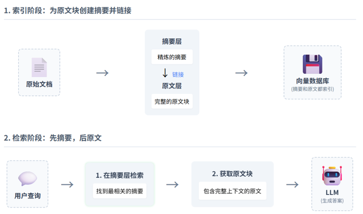 - 原理:为每个块生成摘要,先在摘要层检索,再获取原文块。