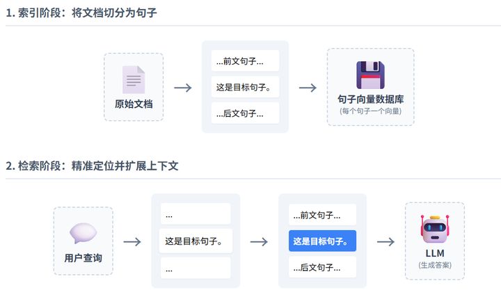 - 原理:检索单个句子(高精度),但返回时附加前后句子作为上下文窗口。