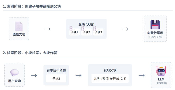 - 原理:小块索引(子块),检索后返回父块(更大上下文)。例如,子块是段落,父块是章节。