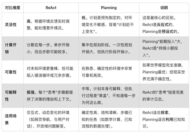 值得注意的是,在实际生产中,ReAct 和 Planning 并不互斥,而是紧密结合。这通常被称为 Planner-Actor 或 Planning-ReAct 模式。