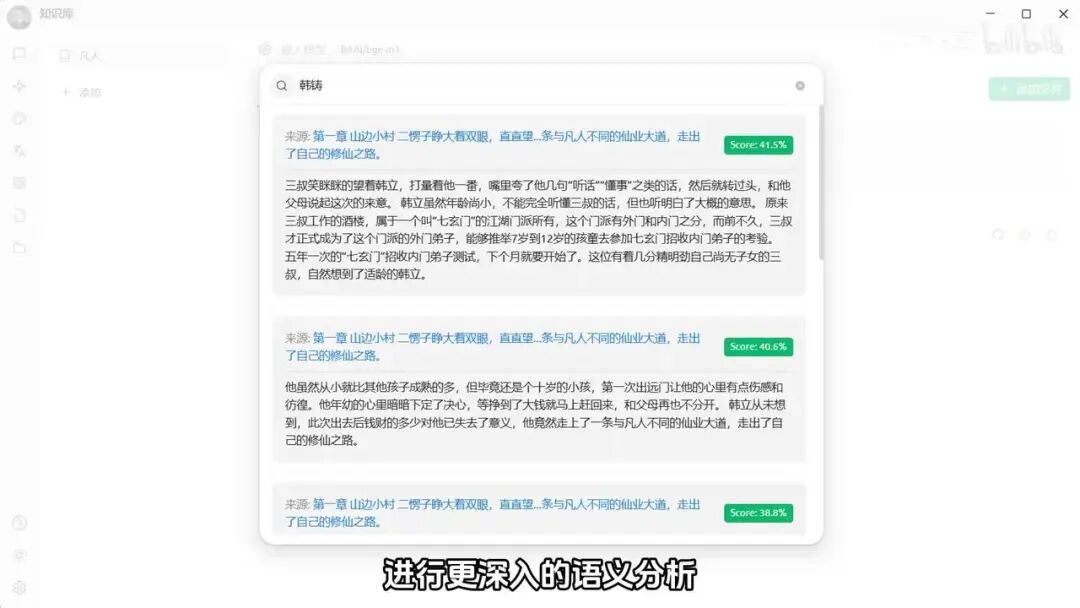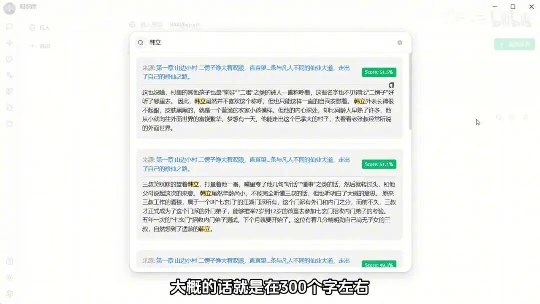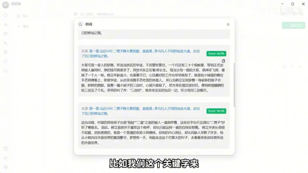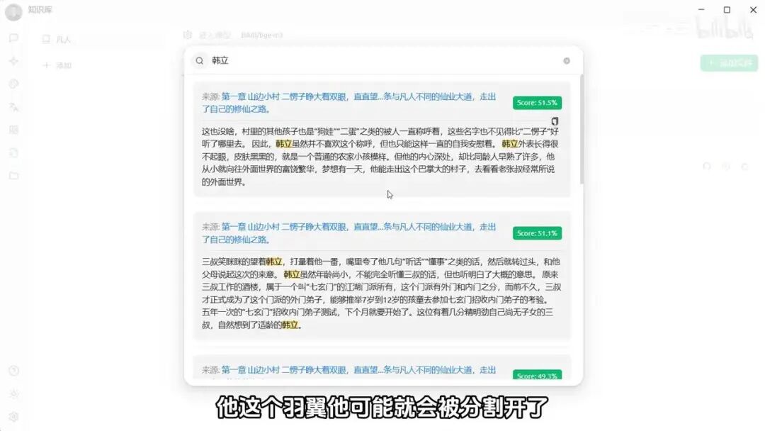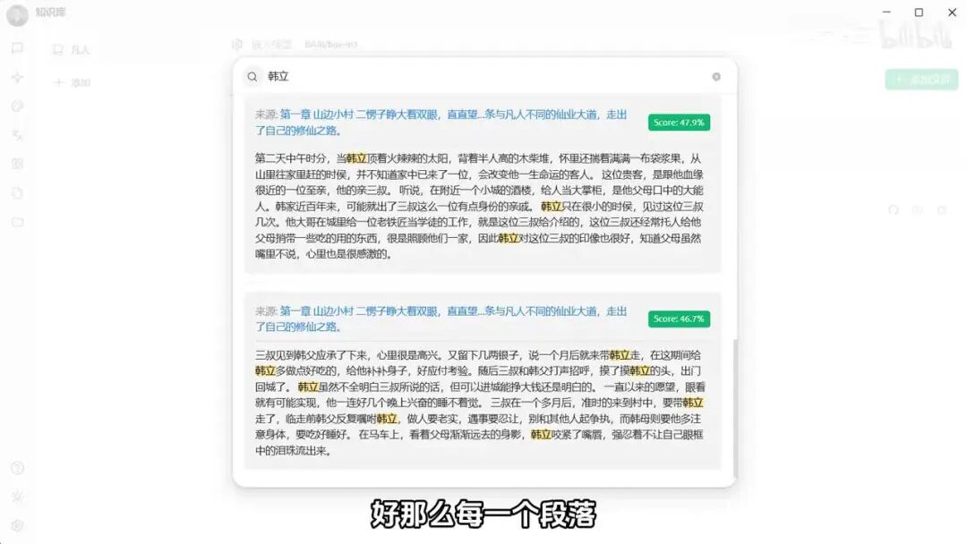 接下来我们再看传统方法的第二个问题,也就是检索不精准。检索不精准怎么看呢?比如我们可以搜索一个名字,比如说叫韩立,那这个韩立有没有出现呢?我们可以看到,现在得到的这几个片段里,其实是没有出现这个名字的。