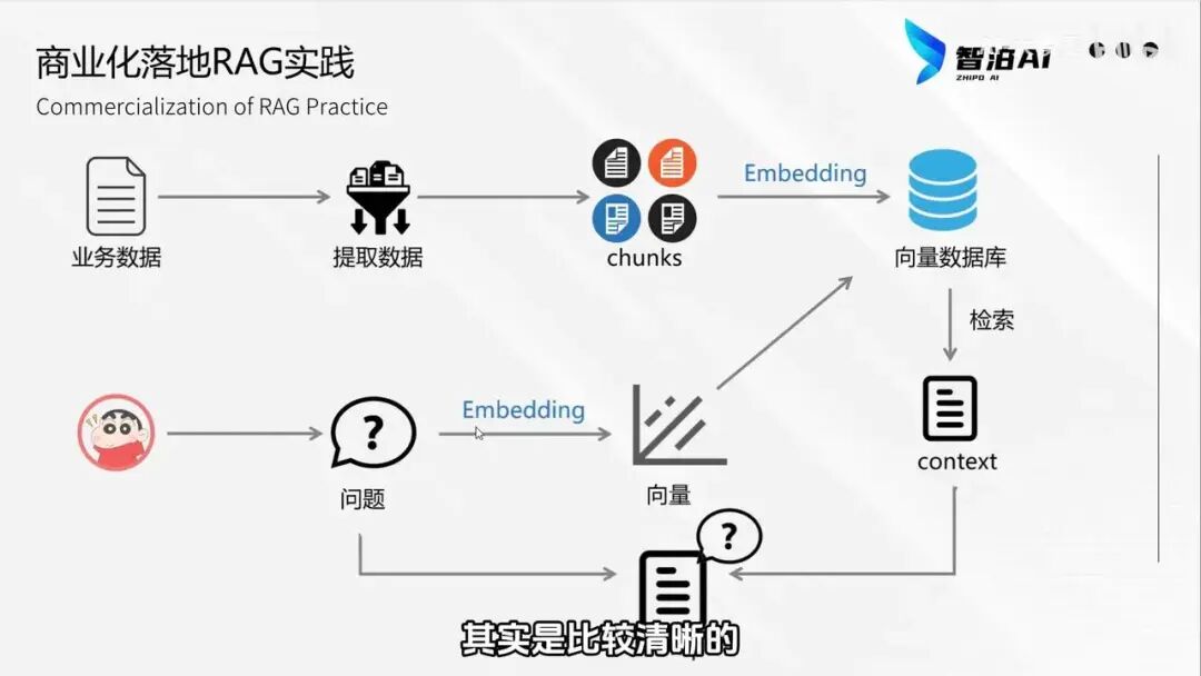 当我们有一部分业务数据之后,需要把这些数据添加到知识库。通过程序将其进行文本块的拆分,然后通过嵌入模型把这些文本块向量化。向量化指的是把文本变成一堆数字,存储到向量数据库里。