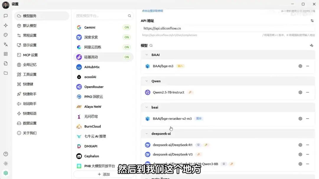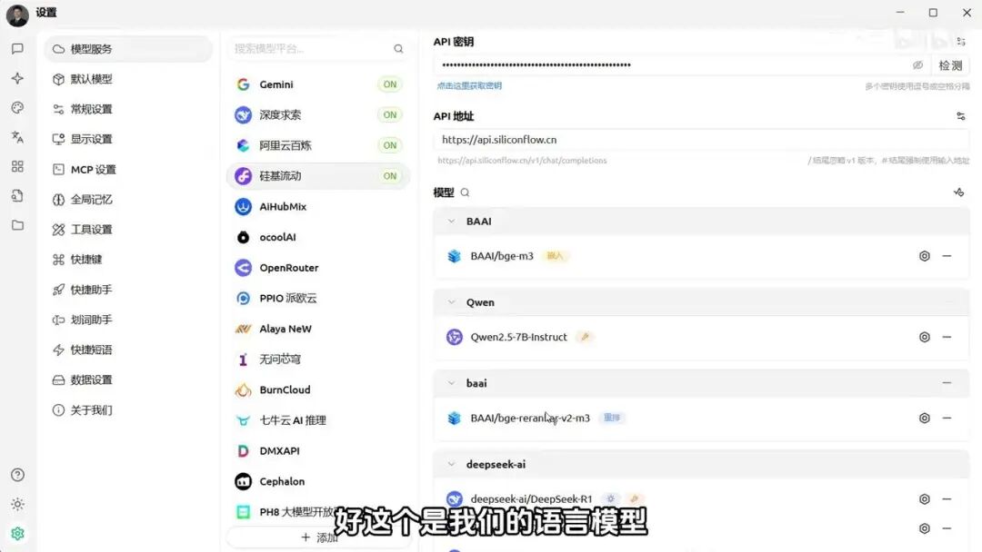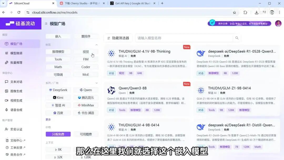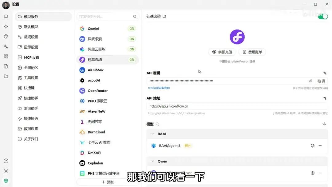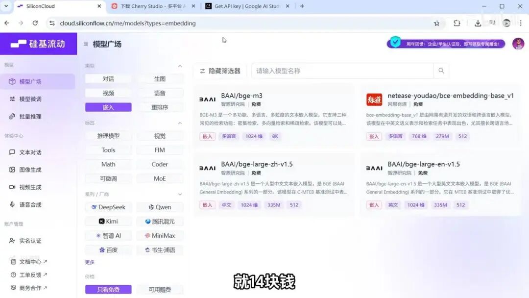 那么在这里,我们直接选择硅基流动。硅基流动需要我们有一个API密钥,所以我们可以来到硅基流动的官网。硅基流动给我们提供了一个免费额度,就是14块钱。