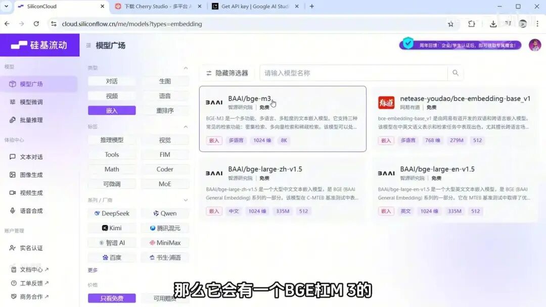 来进行这个嵌入,这个向量化的embedding模型。那么在这地方我们就选择这个嵌入模型,然后免费的,它会有一个GLM-3的。
