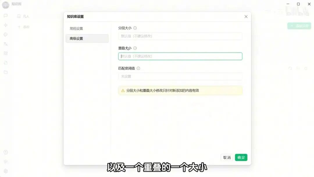 在我们的知识库高级设置当中,可以看到有一个分块的大小以及一个重叠的大小。