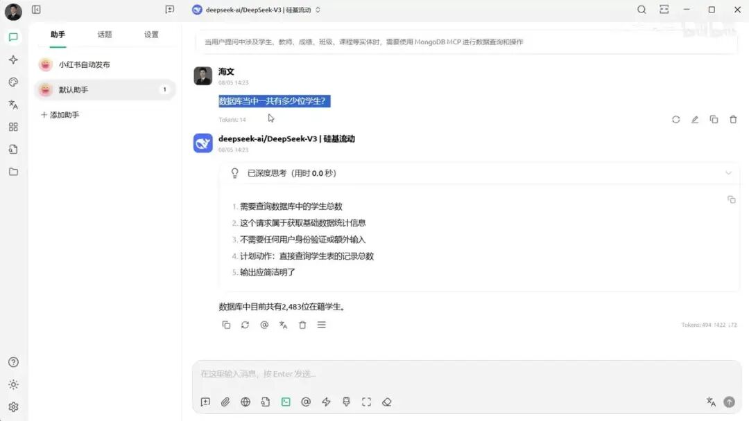 首先,我们打开DB服务。接下来,我们可以问他:“数据库当中一共有多少位学生?”当然,这里还有一个点可以做。
