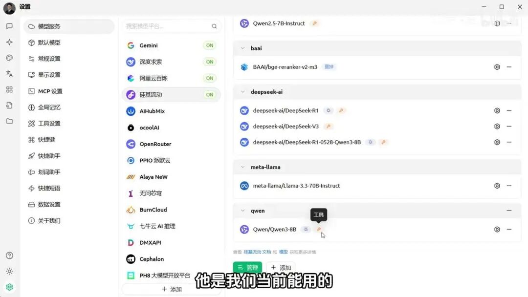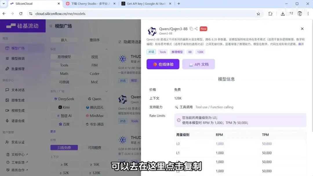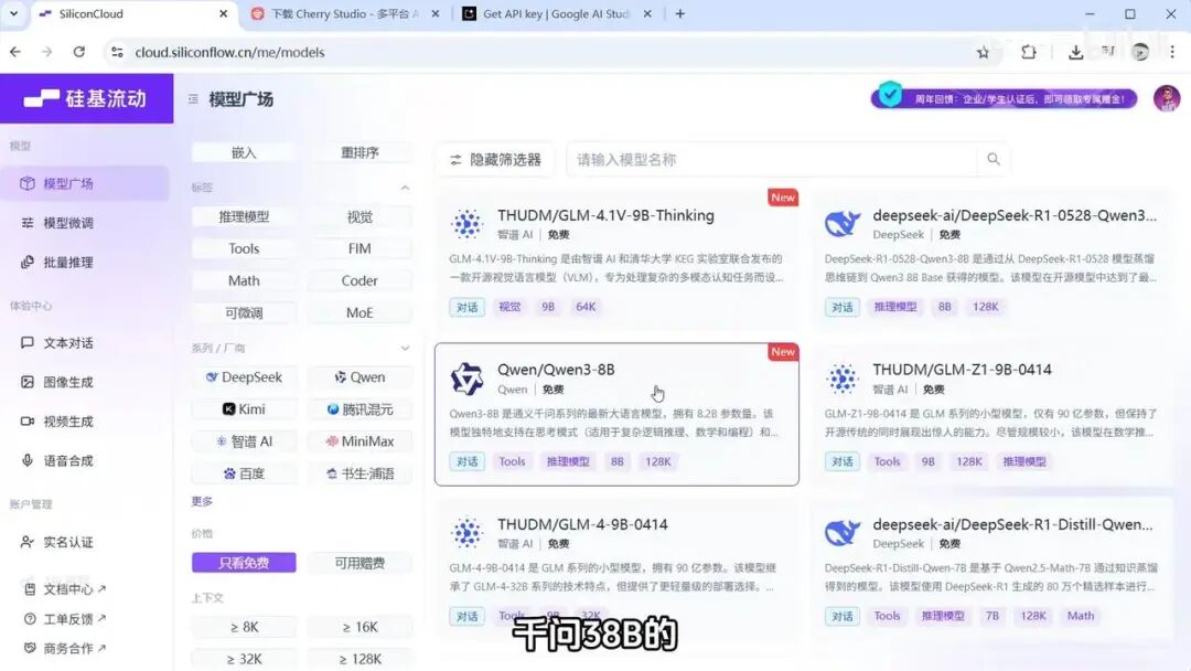 当然有很多都是付费的,我们也可以选择免费的模型。比如这里就有一些免费的模型,比如咱们的千问3-8B,这个我们可以去用。