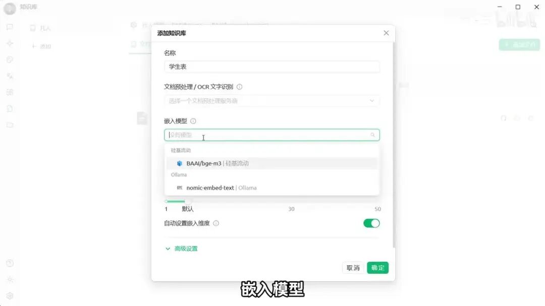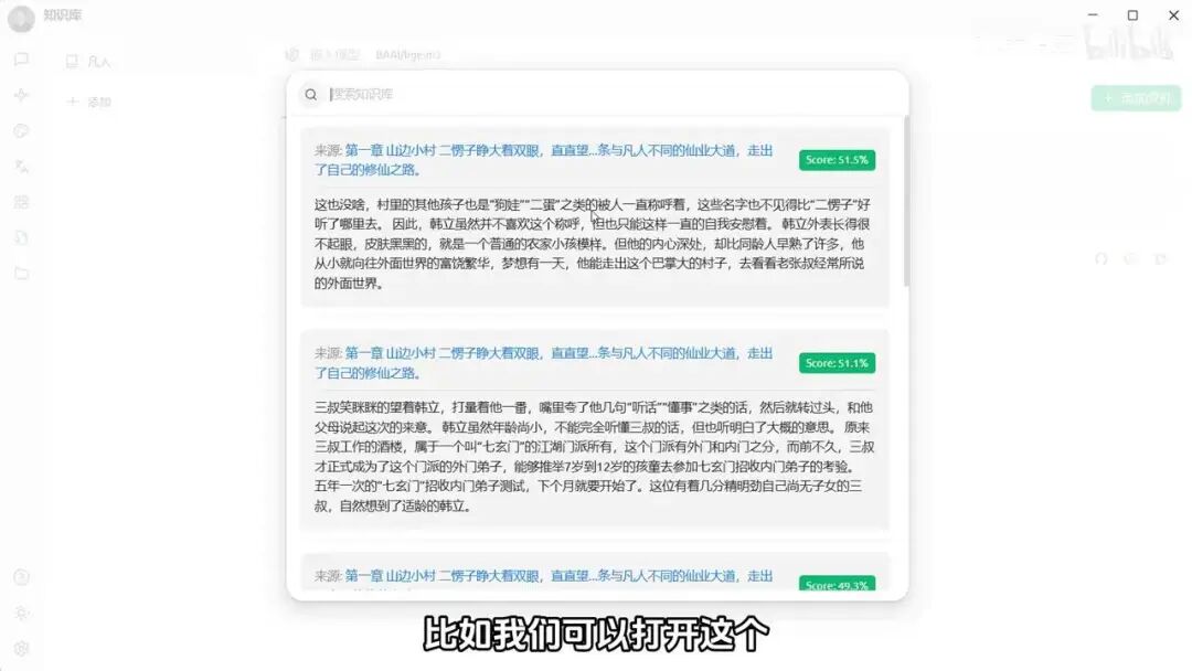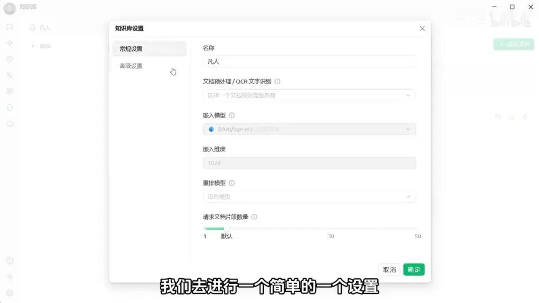 接下来我们开始配置知识库。点击知识库按钮后,可以选择添加,然后随便取一个名字。比如我要对一本小说进行测试,取名为凡人修仙传,然后选择嵌入模型BGE-M3,点击确定。