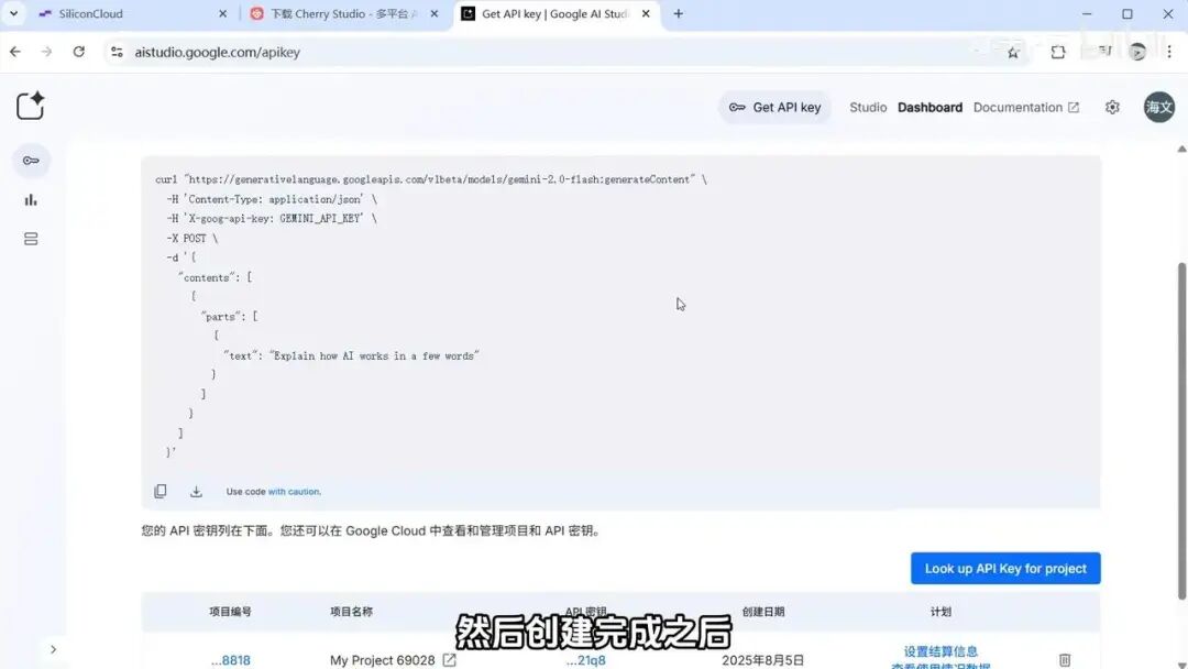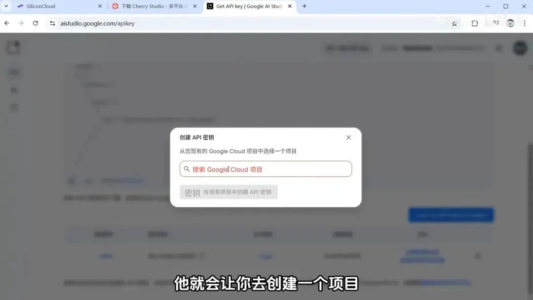 会有一个获取API key的选项,所以我们要点击这个。或者你也可以直接点击创建API密钥,点击一下。点击完之后,它会让你去选择一个项目。