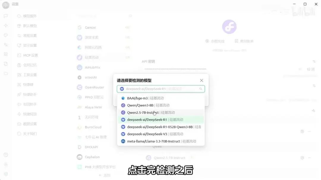 它表示当前可用的模型。如果你不确定,也可以进行检测。点击检测后,选择我们刚刚添加的Qwen3-8B模型,然后点击确定。