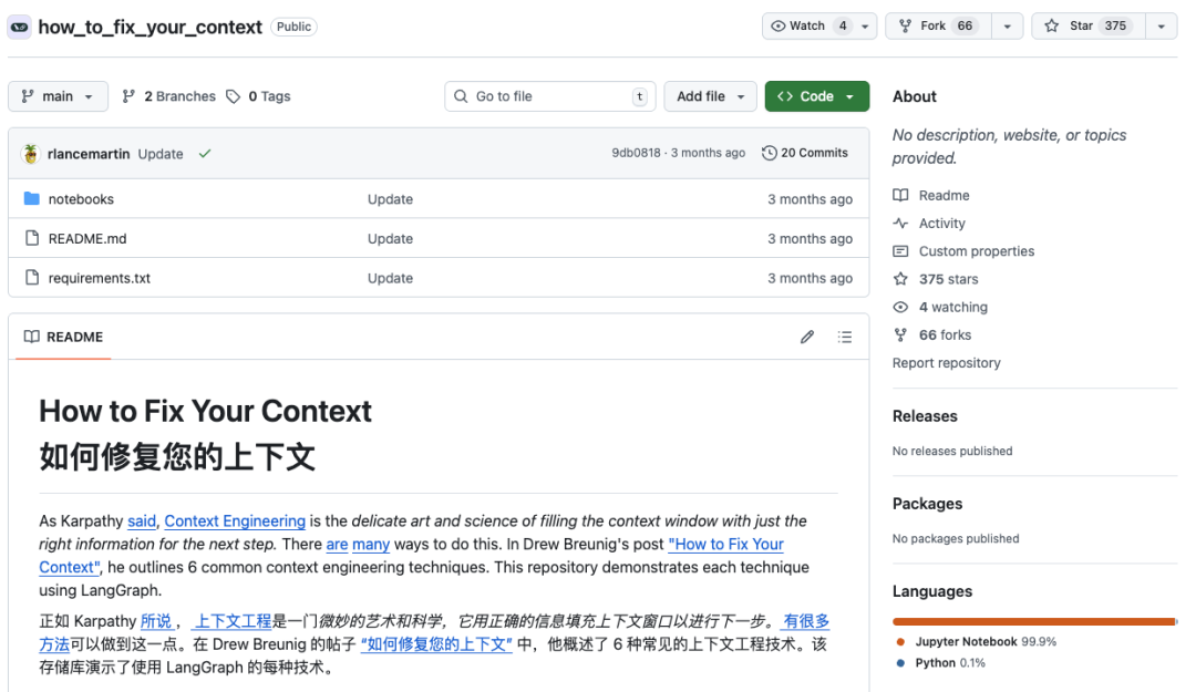 最近,全球知名的 AI 开发框架 LangChain 给出了答案。他们开源了一个项目,叫 how_to_fix_your_context https://github.com/langchain-ai/how_to_fix_your_context。这个项目专门用来演示如何解决上下文太长的问题。