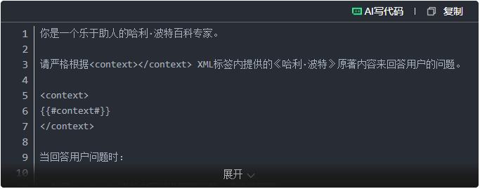 这里的 {{#context#}} 是一个占位符,Dify 在实际运行时,会自动将从知识库中检索到的相关文本块填充到这里。