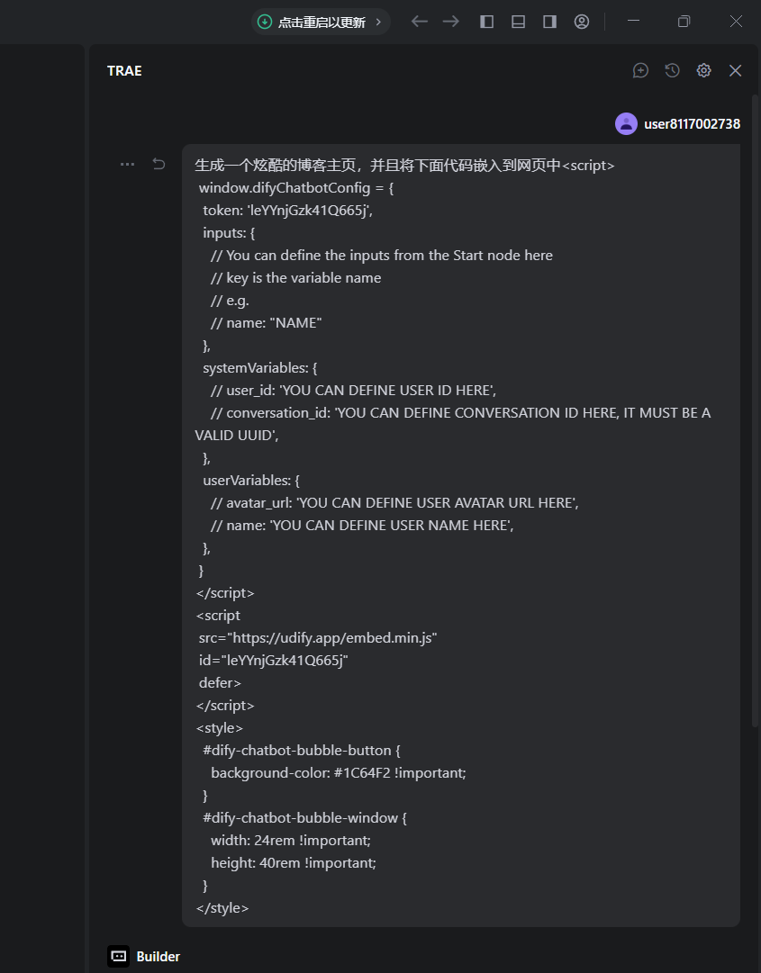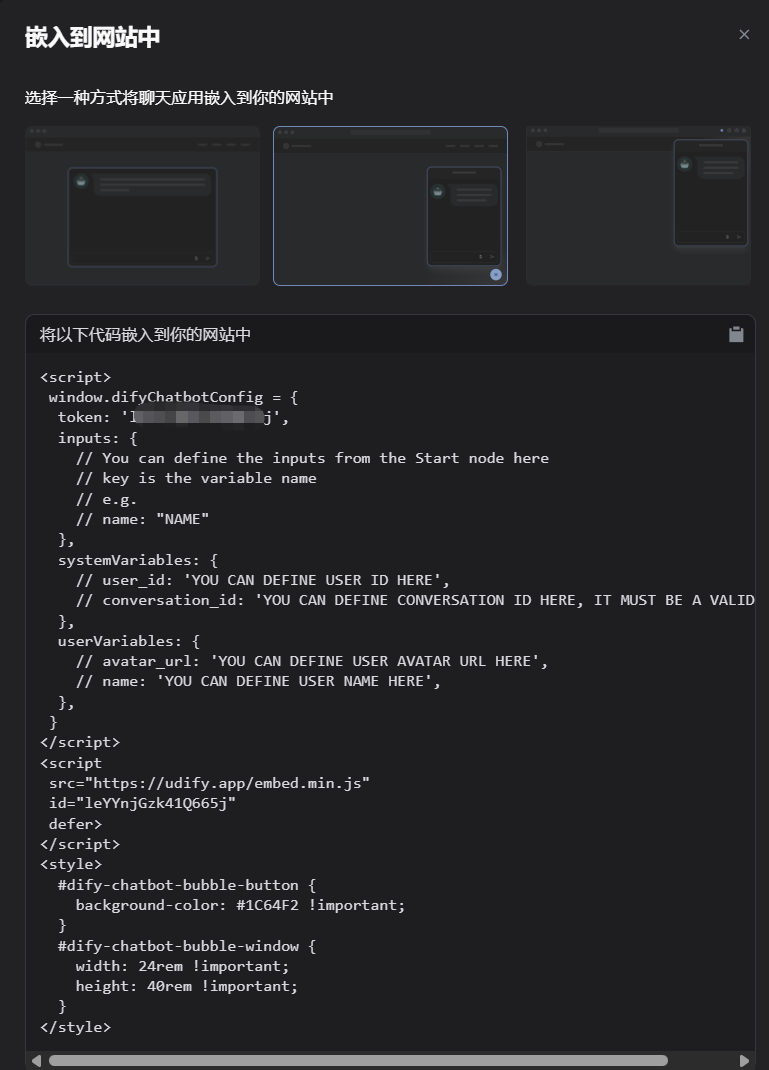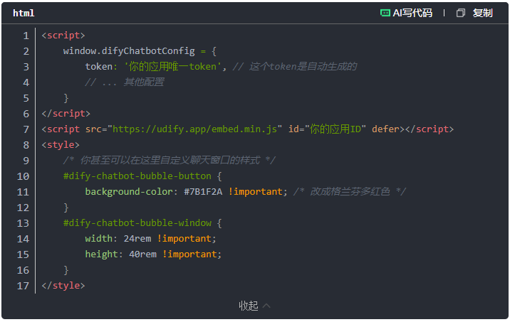 Dify 会自动生成一段 HTML 和 JavaScript 代码。这段代码就是连接你的网站和 AI 助手的桥梁。