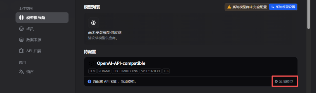 插件安装成功后,回到“模型供应商”页面,点击“添加模型”。