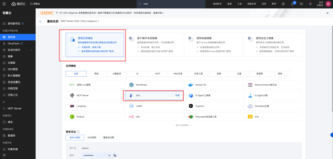 我们直接在云服务器控制台进行重装或创建实例的操作,在选择操作系统镜像时,放弃传统的 CentOS 或 Ubuntu,直接在镜像市场中搜索并选择“Dify”。