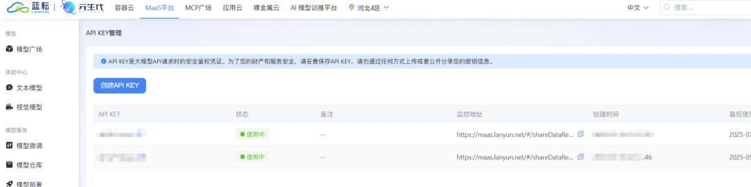 在正式使用模型之前,我们需要创建一个 API-Key。这相当于一把访问蓝耘模型服务的“钥匙”,后续在 Dify 中的配置会用到。请妥善保管好你的 API-Key,不要泄露给他人。
