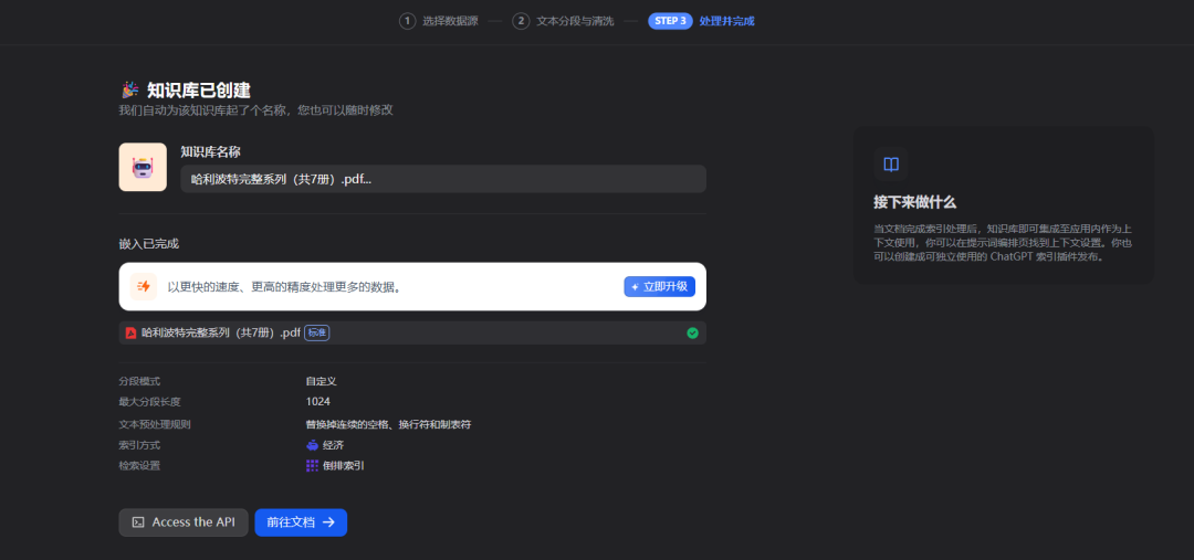 整个过程是全自动的,你只需根据引导完成设置。处理完成后,知识库的状态会显示为“可用”。
