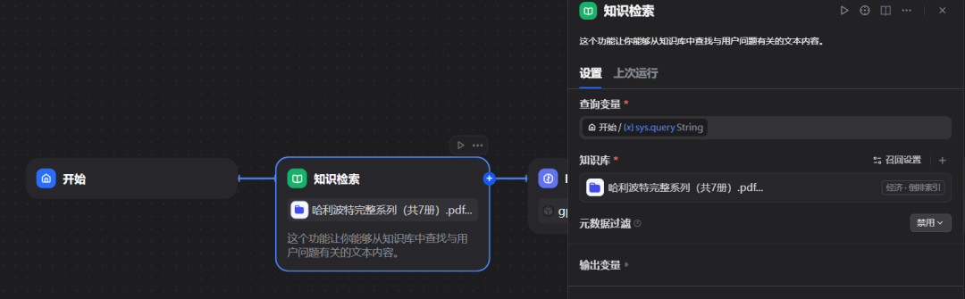 配置知识检索节点: 点击“知识检索”节点,在右侧的配置面板中,将“知识库”选项设置为我们刚刚创建的“哈利波特全书”。