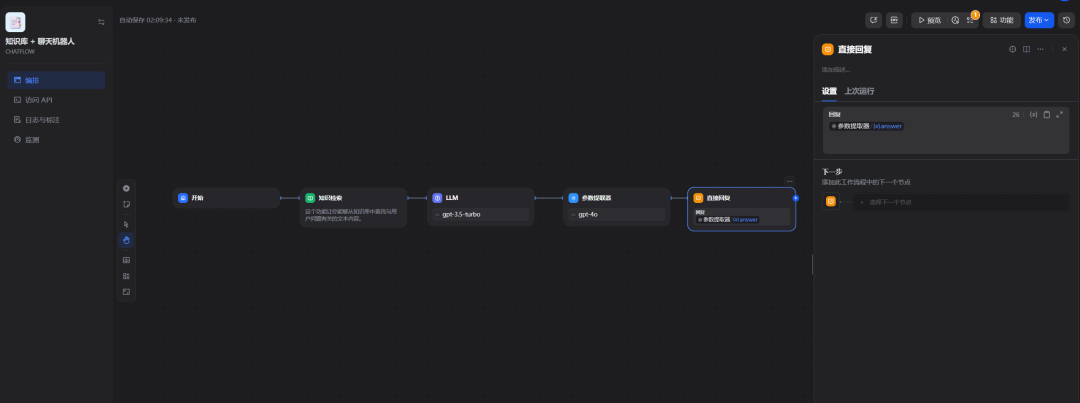 知识库准备就绪,模型也已接入,现在我们需要将它们串联起来,设计一个完整的工作流程 (Workflow),告诉 AI 在收到用户问题后,应该如何一步步地思考和行动。