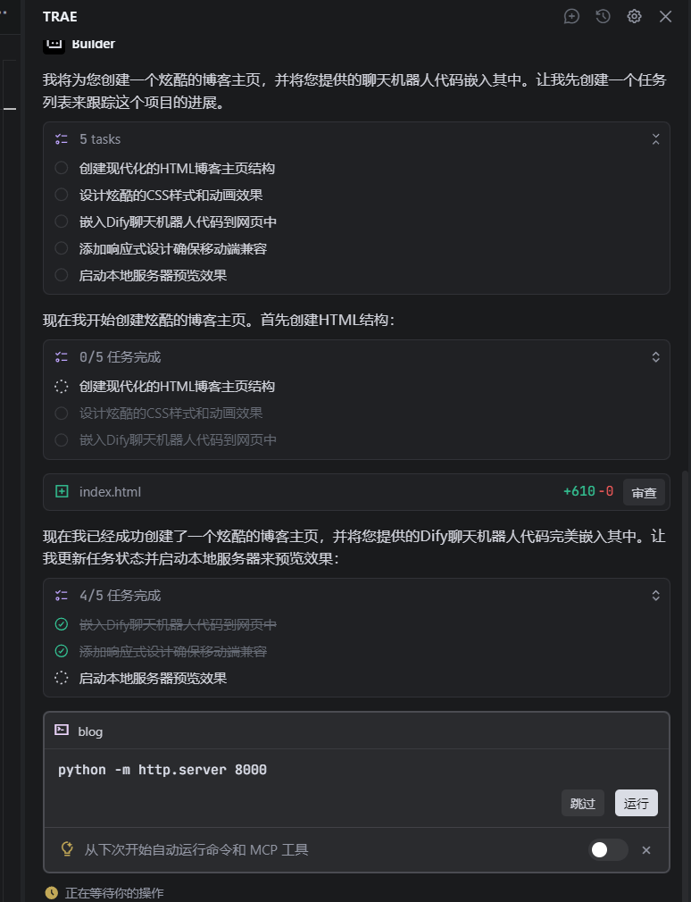 为了在本地预览效果,我们可以使用 Python 启动一个简单的 Web 服务器。在你的网页文件所在的目录下,打开终端或命令行,输入以下命令: