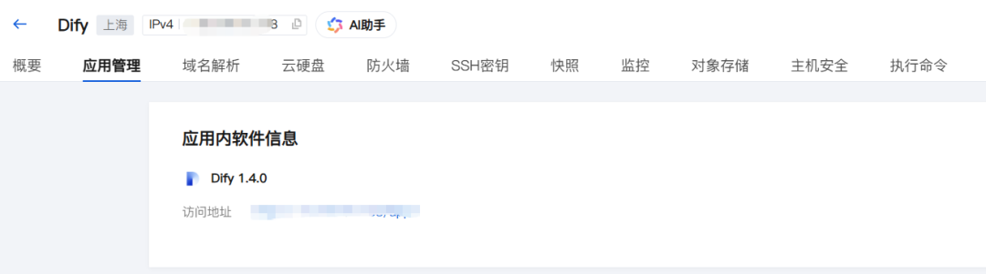 在实例详情页中,找到“应用管理”或类似的标签页。这里通常会展示预装应用的相关信息,最关键的就是 Dify 的后台访问地址。