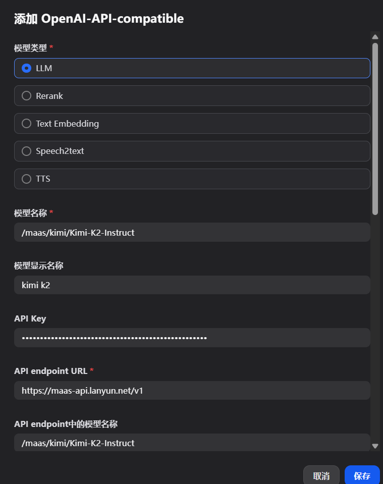 - 模型名称: 为这个模型起一个自定义的、易于识别的名字,比如 lanyun-kimi-k2,方便后续在构建应用时选择。