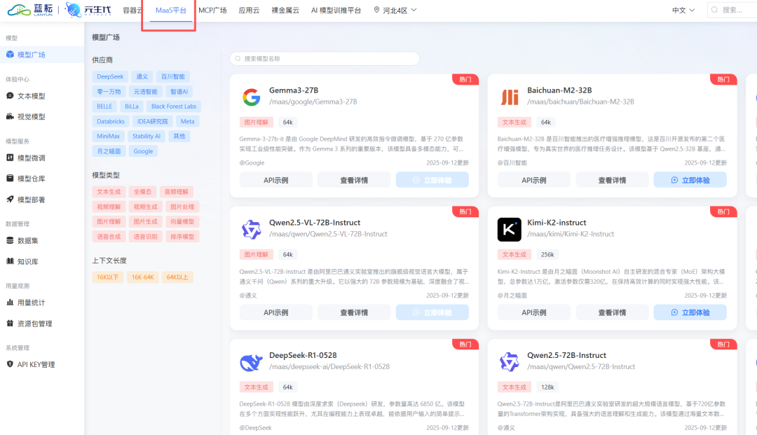 完成注册并登录后,在顶部导航栏找到“MaaS 平台”入口。在这里,你可以浏览平台支持的所有模型及其介绍。