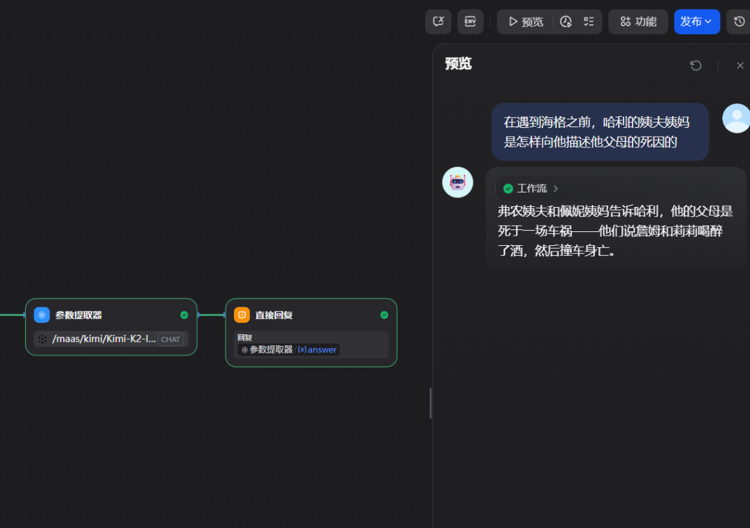 配置完成后,可以直接在画布的右侧进行实时调试。输入一个关于哈利·波特的问题,例如“赫敏的守护神是什么?”,然后点击“运行”。