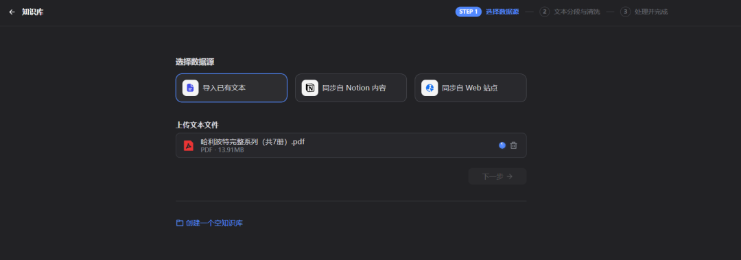 在 Dify 的主界面,点击左侧的“知识库”图标,然后点击“创建知识库”。我们将创建一个名为“哈利波特全书”的知识库。