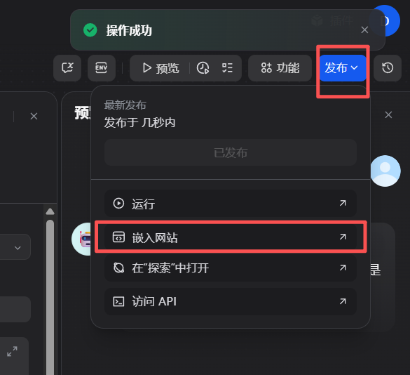 应用发布后,Dify 提供了多种集成方式,其中最便捷的就是“嵌入网站”。