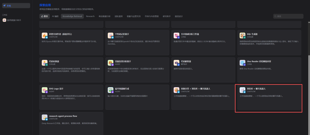 回到 Dify 主页,点击“创建应用”,选择“聊天机器人”类型。Dify 提供了多种预设的应用模板,我们直接选择“知识库+聊天机器人”这个最经典的模板。