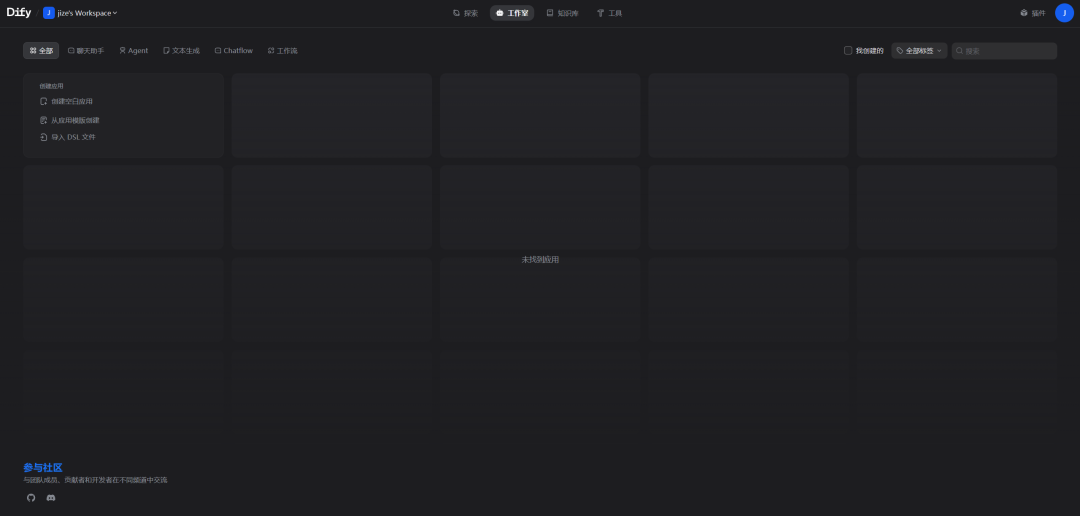 成功登录后,你将看到 Dify 的主界面。这是一个设计简洁且功能强大的工作台,你可以在这里开始探索和构建你的第一个 AI 应用了。
