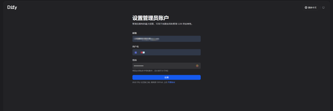 点击该访问地址,浏览器将带你进入 Dify 的初始化界面。首次访问时,系统会引导你创建一个管理员账户。请务必填写真实有效的邮箱,并设置一个安全的密码。这个账户将是你管理整个 Dify 平台、创建和维护所有 AI 应用的最高权限账户。
