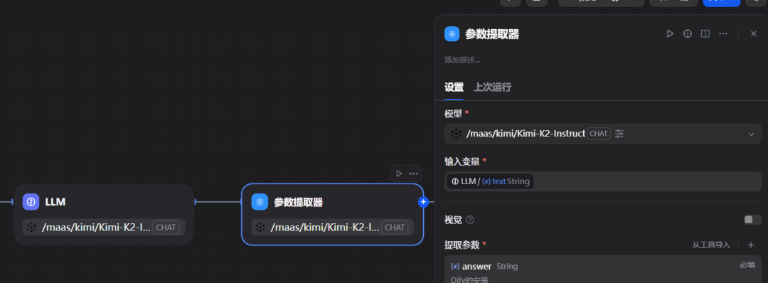 配置 LLM 节点: 点击“LLM”节点(在模板中可能还有“参数提取器”等也需要配置),在模型选择下拉框中,选择我们之前配置好的 lanyun-kimi-k2 模型。