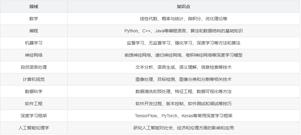 成为一个AI工程师难度实际上是非常高的,很多岗位都起码是要硕士起步,因为需要学习的东西非常多,也需要不断积淀,具体而言,深入学习这些领域的原理、算法和实践经验将有助于成为一名优秀的AI工程师。下面列表一些相关知识: