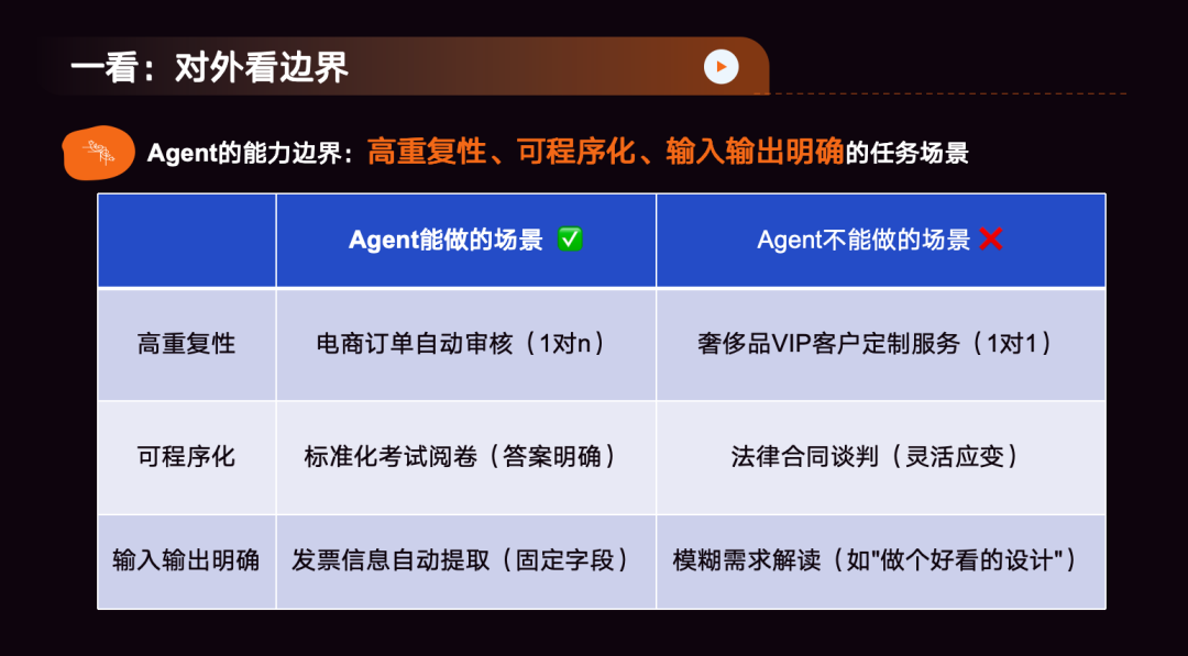 - 一看:先从外部界定,明确Agent适合处理高重复、可程序化、输入输出清晰的场景。