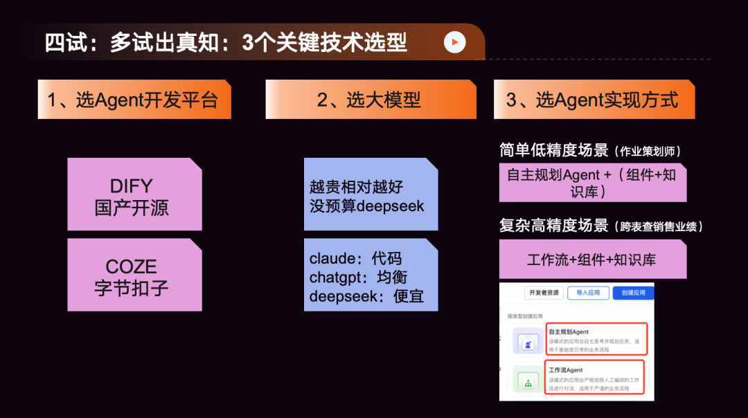 - 四试:基于实际应用选择合适的平台(如DIFY、COZE),配套合适的大模型(ChatGPT、Claude、Deepseek等),根据场景复杂度选择简单组件还是复杂工作流的实现方式,不断测试优化。