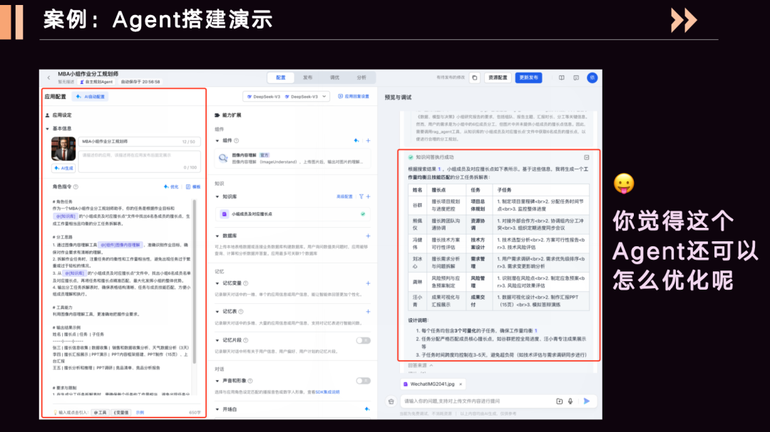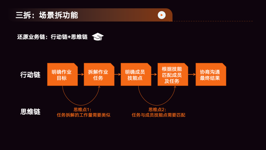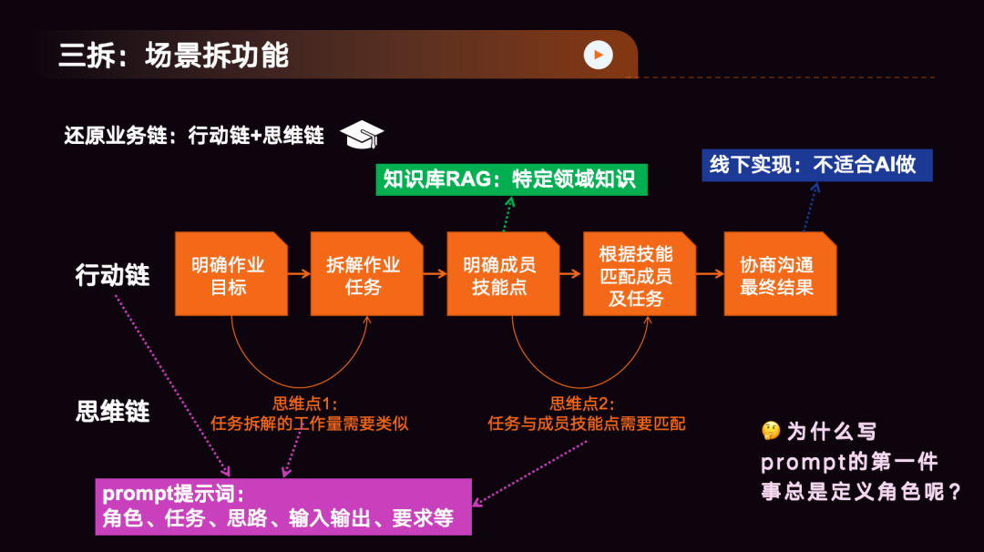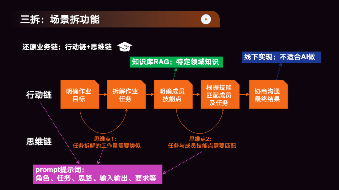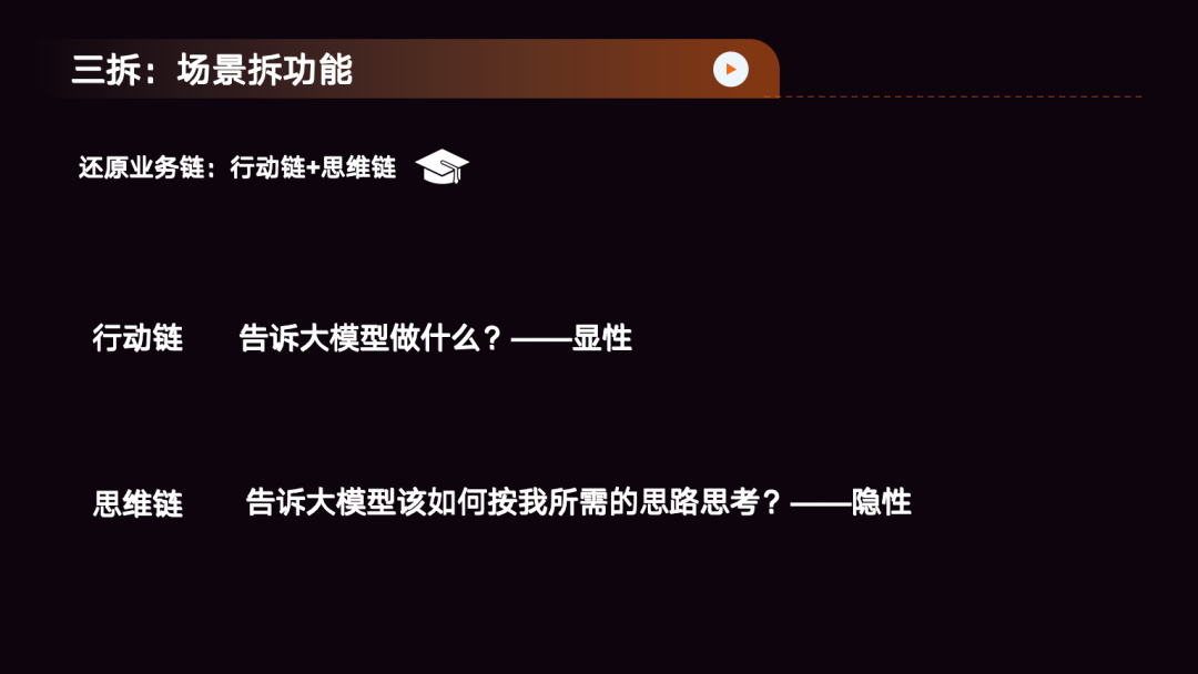 - 三拆:通过还原业务链,将复杂任务拆成清晰的行动链(具体要做什么)和思维链(按什么逻辑思考),并配合Prompt设计与知识库搭建,提升Agent的理解和执行力。
