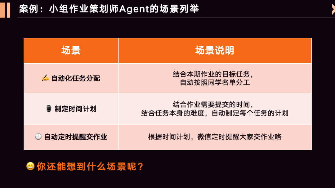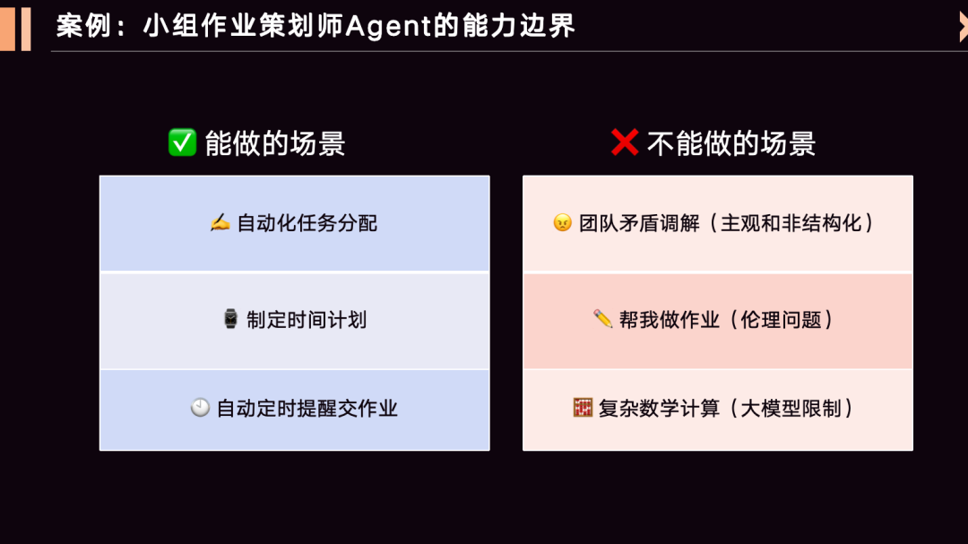 Agent可以根据作业目标和成员技能点,自动拆解任务、合理分配、制定时间表并定时提醒,大大提升小组协作效率。同时也明确了边界,比如伦理问题(不能代做作业)和处理模糊主观需求的局限。