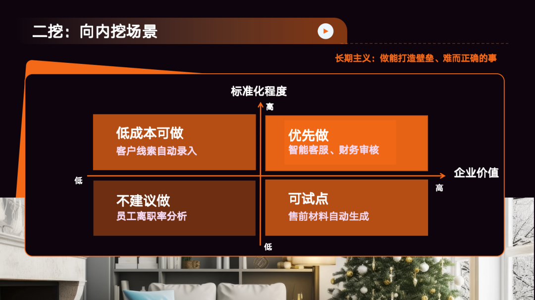 - 二挖:向内挖掘具体场景,优先选择标准化程度高、能带来企业价值的方向,比如自动化任务分配、售前材料生成等。
