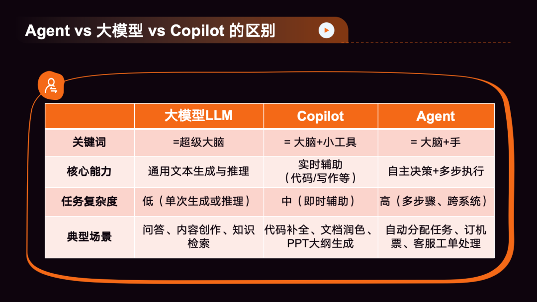 开篇通过一个小测试,帮助大家直观理解什么是Agent。相比传统只被动执行指令的工具,Agent能够自主理解目标、拆解任务、调用资源并完成执行,真正像一个“智能助理”。不同于大模型(LLM)只负责文本推理生成,或Copilot即时辅助的功能,Agent能进行更复杂的多步骤、跨系统决策与执行。