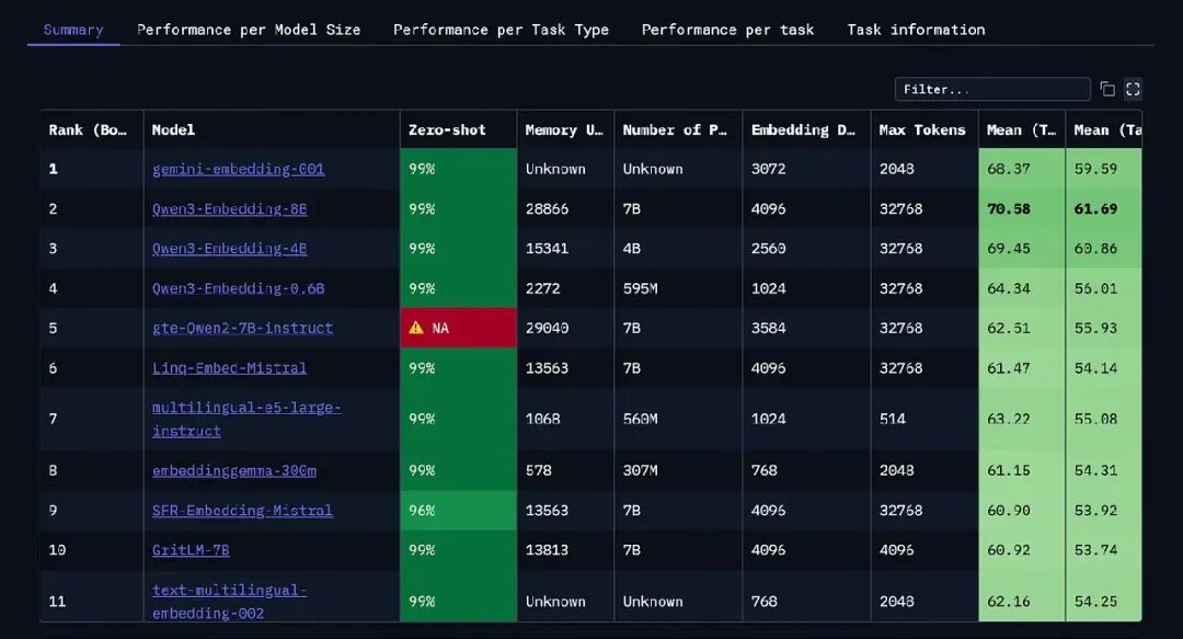 MTEB 是挑 embedding 模型的有用工具。不同模型在不同任务闪光。MTEB leaderboard 显示每个模型跨广泛任务的表现。这能帮你为特定需要缩小选择。