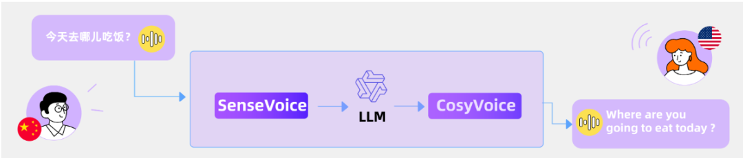 首先将输入的语音通过Sensevoice转成文字,输入给大模型,转出目标语言文字,最后通过CosyVoice的多语言复刻模型转成目标语言语音,最后完成语音到语音的翻译