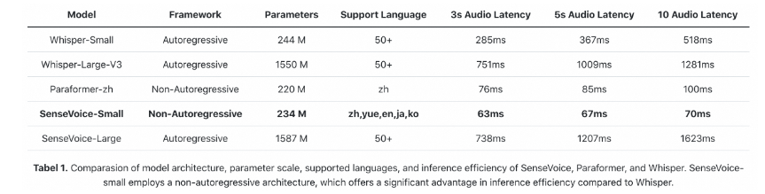 SenseVoice-Small模型部署了一个非自回归的端到端架构,从而实现了极低的推理延迟。由于与Whisper-Small模型的参数数量相似,它的推断速度比Whisper-Small快5倍以上,比Whisper-Large快15倍。