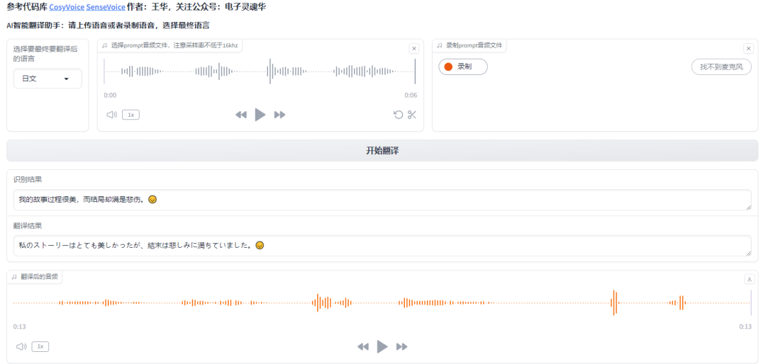 实现方法通过集成SenseVoice、CosyVoice、本地大模型(qwen2:7b),完成语音翻译