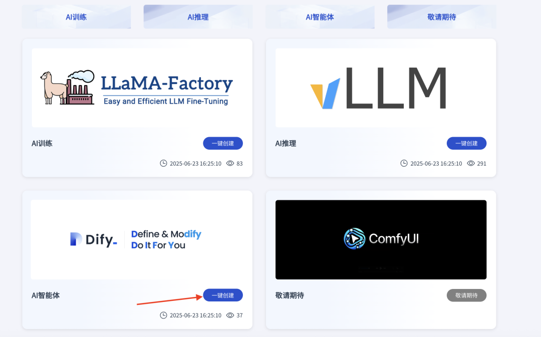 在 “AI 训练营” 页面,选择 Dify 并一键创建。