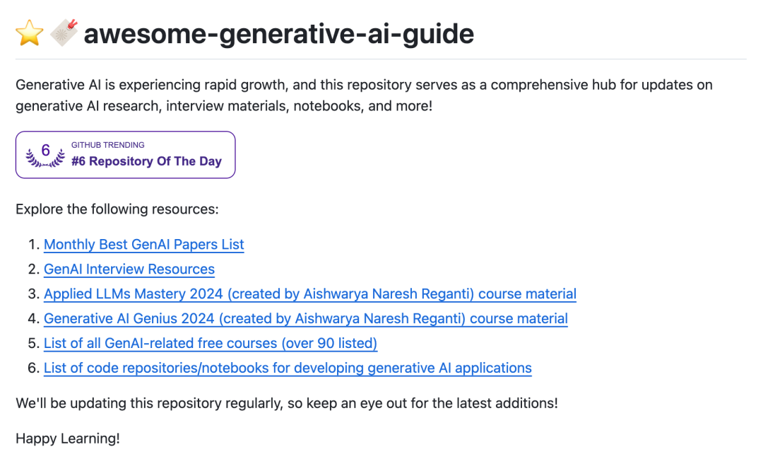 Awesome Generative AI Guide 是一个精心整理的学习资源合集,几乎涵盖了整个 GenAI 方方面面: 从文字生成、图像生成,到研究论文、开源项目、实战案例……应有尽有。