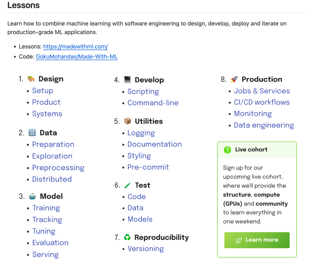 Made with ML 是由 Goku Mohandas 创建的开源学习项目,也是很多工程师心中的“机器学习实战圣经”。 它不仅教你怎么写代码,更重要的是教你怎么像一名工程师那样思考: 如何设计可扩展的系统,如何快速迭代产品,如何理解每个技术决策背后的“为什么”。