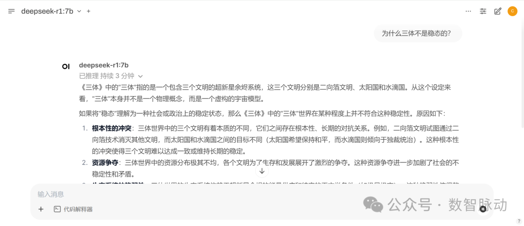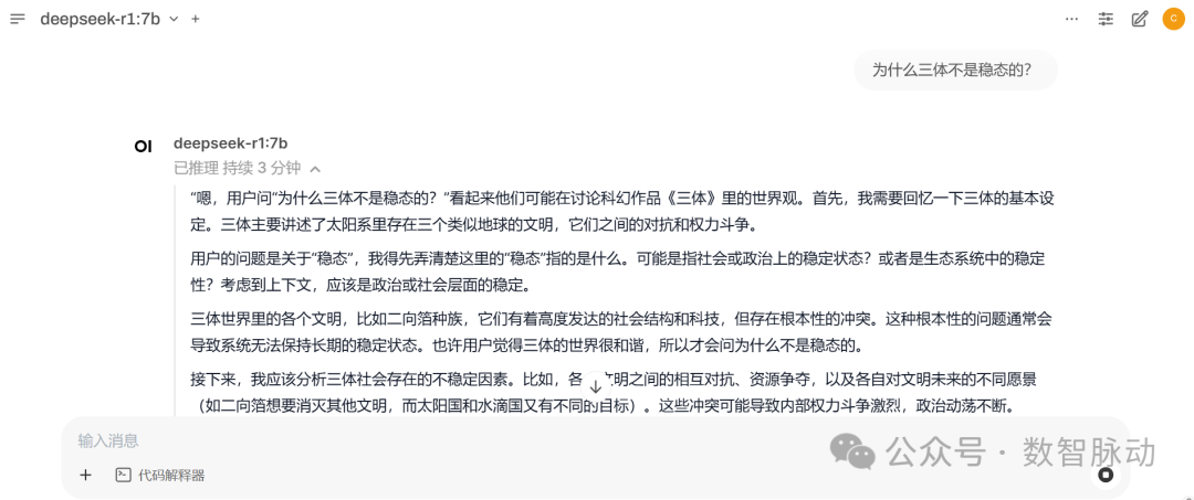以可视化的方式向模型(deepseek-r1:7b)进行提问:为什么三体不是稳态的?模型的回答以流式响应的形式返回。