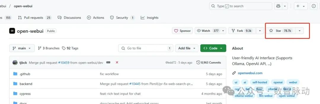 本文在已部署安装 Ollama 的基础上,介绍 Open WebUI 的功能特性、安装步骤,初步搭建私有化的 AI 应用平台。 Open WebUI 的文档地址:https://docs.openwebui.com/,github项目为 https://github.com/open-webui/open-webui,目前已有 78.7 K stars,很火的 AI 应用项目。